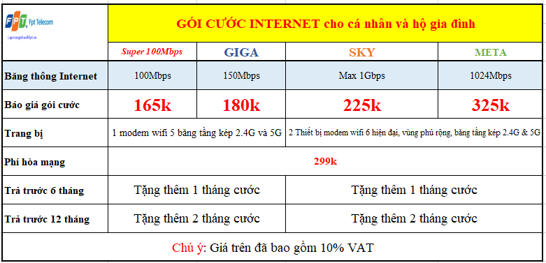 Bảng giá đã bao gồm thuế VAT Gói cước internet cáp quang gia đình tốc độ cao